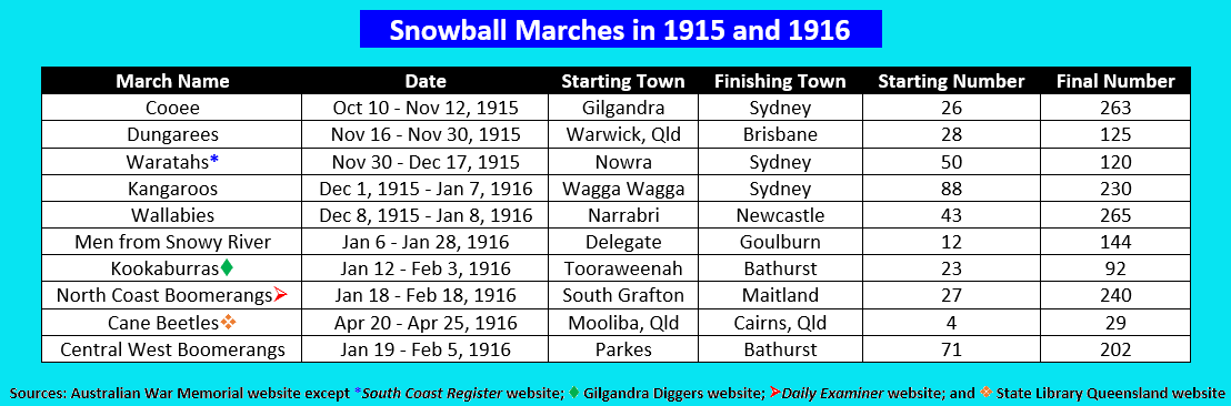 The “snowball” marches of the Great War that impacted communities in regards to recruitment and awareness. Sources: Australian War Memorial website, South Coast Register website, Gilgandra Diggers website, Daily Examiner website and State Library Queensland website.