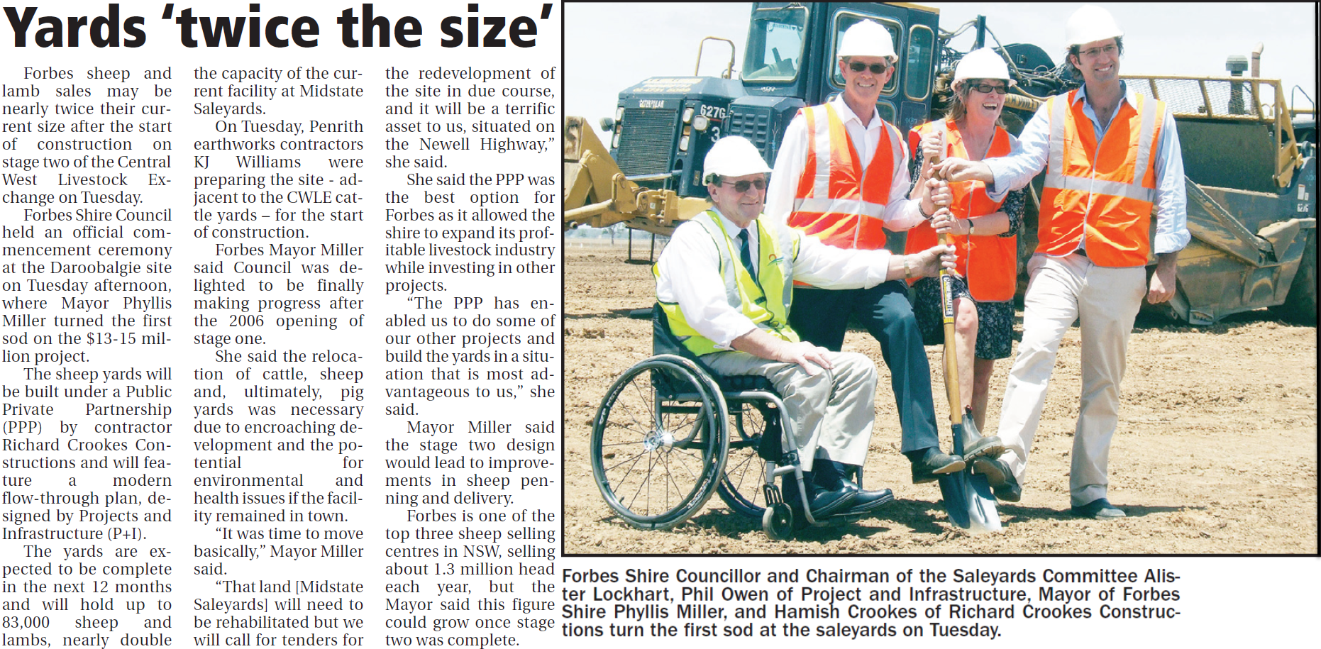 Dignitaries turn the first sod at stage two construction of Central West Livestock Exchange at Daroobalgie. Source: Parkes Champion Post Friday December 11, 2009 p.22