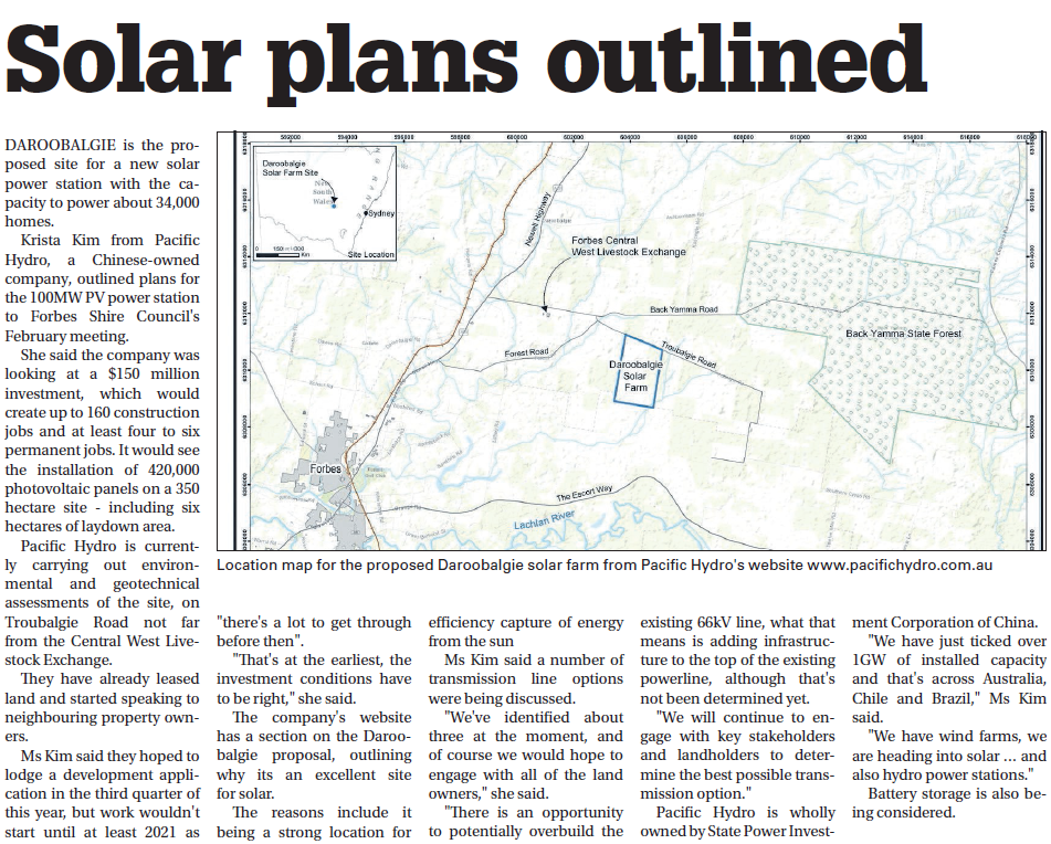 The future of Daroobalgie? A solar farm is proposed for Daroobalgie that has the capacity to power about 34,000 homes. Source: Parkes Champion Post Tuesday March 5, 2019 p.3