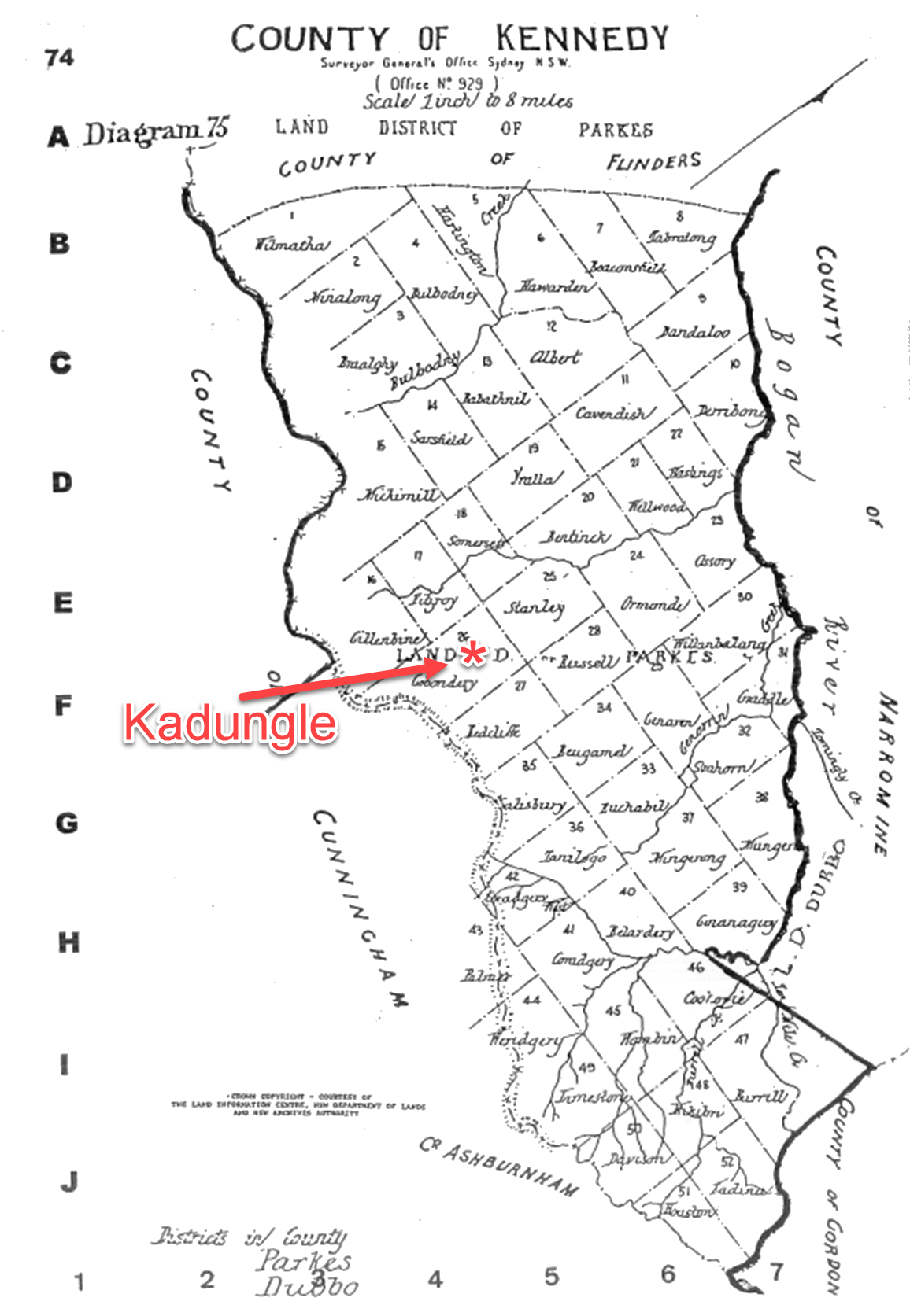 Map showing approximate location of Kadungle, in the parish of Gobondery, in county Kennedy. Source: County & Parish Maps of NSW with Index by Alice Jansen (1999) p.74