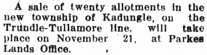 The first mention of Kadungle (this spelling, not the original Cardungle) in newspapers appears in 1908 in an article about Public Works Tenders. A tender had been accepted to erect station buildings at The Troffs, Kadungle, Gobondery and Tullamore.
