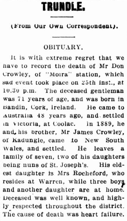 PLEASE NOTE: While the newspaper report states the name of the deceased as ‘Don’, the family has been in touch with Parkes Shire Library and the correct name is DANIEL CROWLEY.