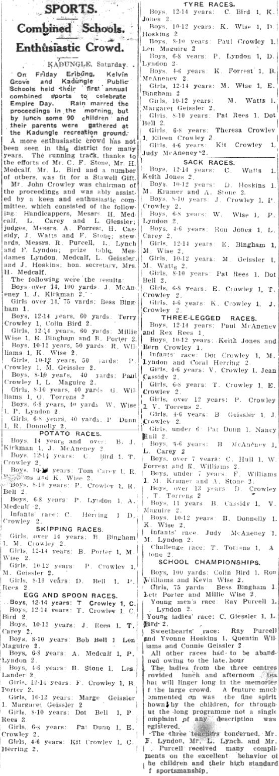 Kadungle had an active P&C Association, with meetings being held quarterly. In 1941 Kadungle decided to hold a combined sports gathering with Eribung (Numulla), Kelvin Grove and Gillenbine Schools to celebrate Empire Day. Correspondence students were also invited to participate. The gathering became an annual event and the forerunner of the Gobondery Sports Carnivals.