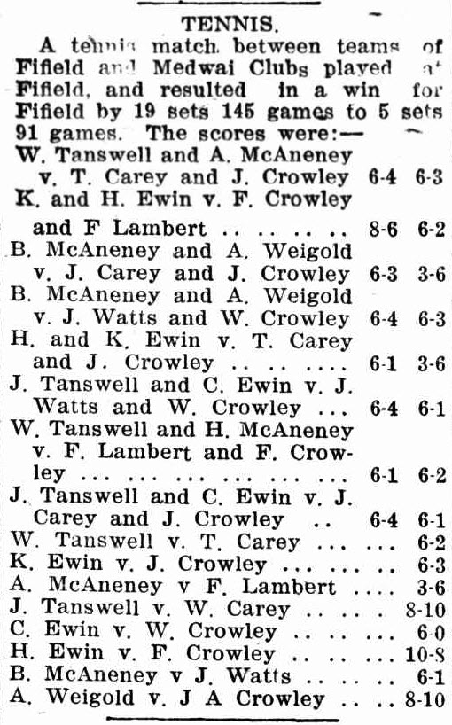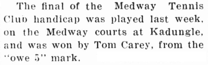 Another reference to Kadungle’s Medway Tennis Club which also highlights how popular tennis was many years ago. Fifield and Kadungle (Medway) had tennis clubs, along with other towns and villages that have almost vanished. Source: Western Champion 23 June 1921, p.11