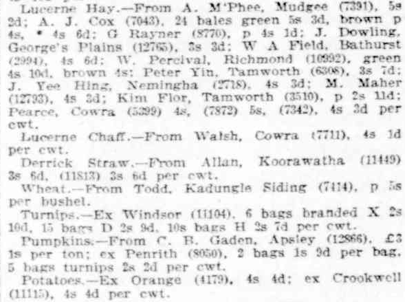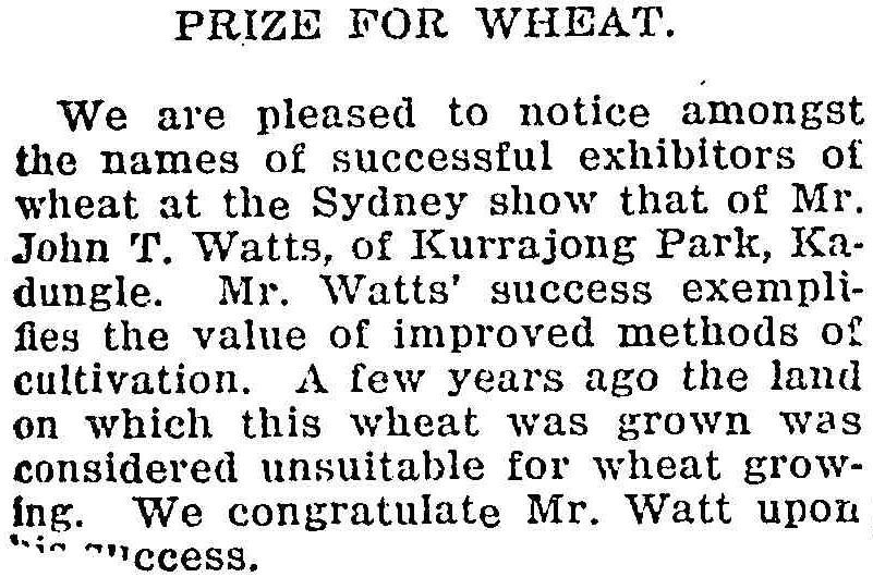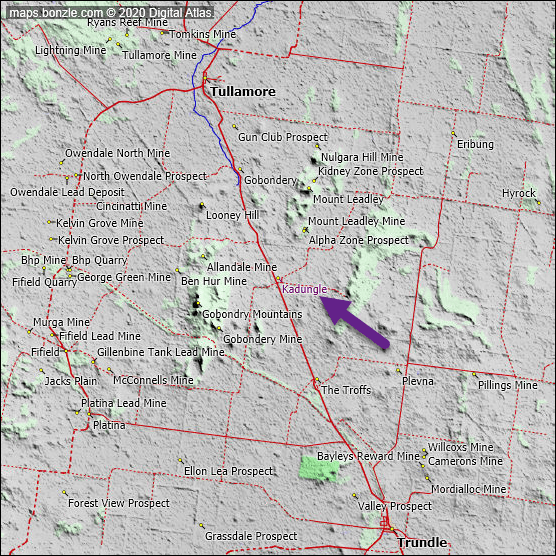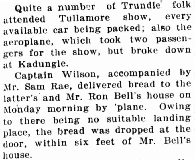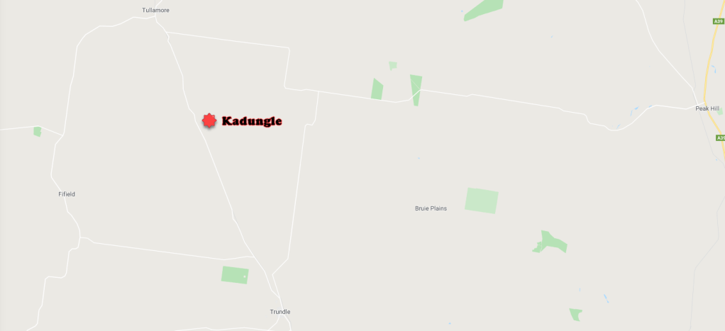 Records of tennis tournament between Tullamore and Kadungle. Source: Western Champion 14 July 1927, p.15Sources: 1947 Census, 1954 Census and 1961 CensusKadungle was identified early as good fertile land for agriculture, despite some believing the opposite. John Watts of ‘Kurrajong Park’, Kadungle proved that a good cultivator knows how to produce high quality crops by wining a prize for his wheat. Source: Western Champion 21 April 1927, p.13Kadungle located 15km away from Tullamore and 20km from Trundle on The Bogan Way. Source: BonzleCaptain Wilson was piloting an aeroplane on the way to the Tullamore Show, but the plane broke down at Kadungle. After repairs, Captain Wilson delivered bread to the Rae’s and Bell’s dropping the bread from midair. Source: The Forbes Advocate 13 September 1921, p.1