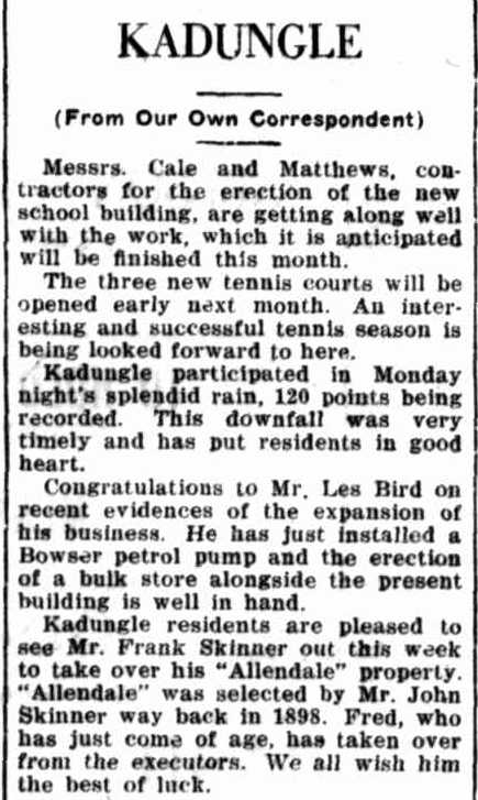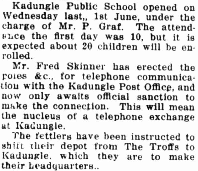 The rise of Kadungle. Kadungle Public School finally became a reality on June 1st, 1927. Another Kadungle family, the Skinners, erected poles for telephone communications at Kadungle Post Office. In addition the fettlers were instructed to move their depot from The Troffs to Kadungle. Source: The Forbes Advocate 7 June 1927, p.3