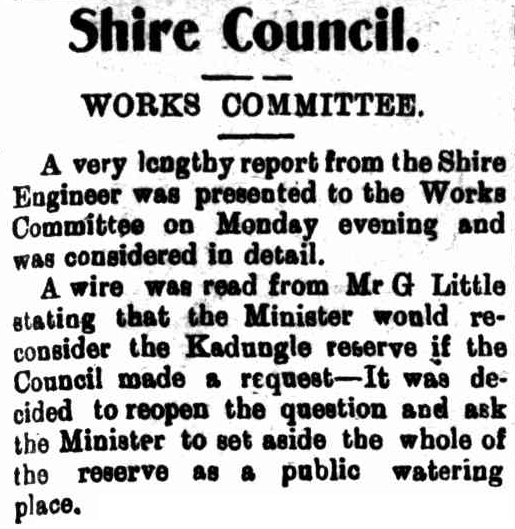 Newspaper report on the [Goobang] Shire Engineer working on having all of Kadungle reserve set aside for public watering. Source: Western Champion February 5, 1909 p.15