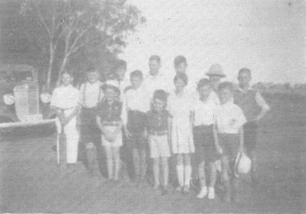 Kadungle School Cricket Team 1940. Taken at Eribung (Numulla). Back (left to right) – Colin Bird, Keith Jones, Gordon Johnson, John Wise, Bernie Crowley, Arthur Stone, Kevin Wise. Front – Peter Lyndon, Colin Watts, David Lyndon, Mary Watts, Arthur Medcalf, Paul Crowley. Note Arthur Stone with pith helmet. This was not unusual headgear even in the 60s. Source: Shirley Mills et al (1990) p.99