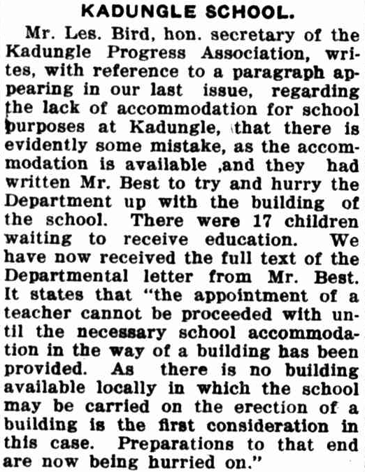 While there were 17 children waiting to become students at Kadungle School, there were delays in appointing a teacher for the school. Source: Western Champion 9 September 1926, p.11