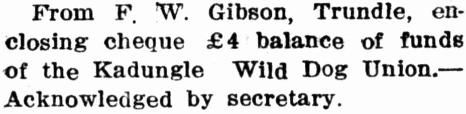 One of the more interesting groups that research has uncovered is a group called “Kadungle Wild Dog Union” who are only listed twice in Western Champion and both times for giving donations to Parkes District Hospital. Source: Western Champion 20April 1916, p.28