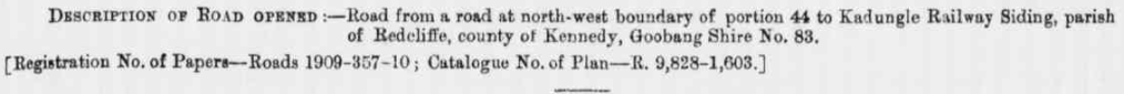 NOTIFICATION, UNDER THE PUBLIC ROADS ACT OF 1902, OF WITHDRAWAL AND DEDICATION OF LANDS FOR ROAD. (August 24, 1910). Government Gazette of the State of New South Wales (Sydney, NSW : 1901 – 2001), p. 4749. Retrieved August 27, 2020, from http://nla.gov.au/nla.news-article226766456