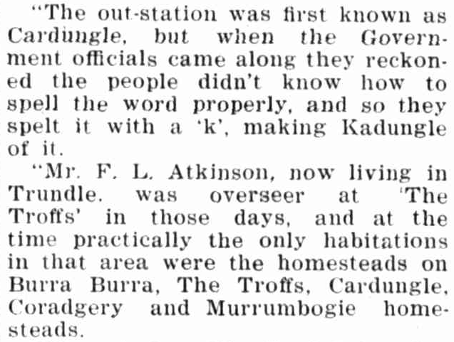 An earlier published mention of Cardungle is in the 1892 list of new postal routes opened, “Tomkins’ (near Trundle) to Cardungle”, once a week; page 527 of NSW Parliament Votes & Proceedings, Volume 2.