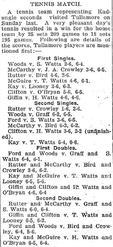 One family with strong links to Kadungle are the Crowleys. Don Crowley lived on ‘Moira’ station until his death in 1916. The Crowleys produced some very good tennis players, who played for the local club at Kadungle called the Medway Tennis Club.