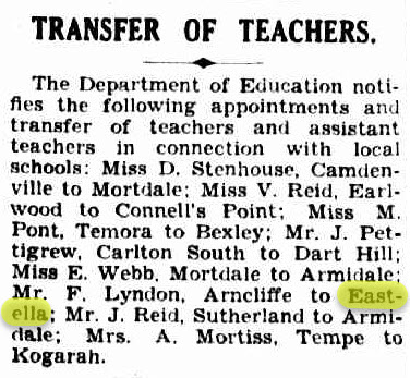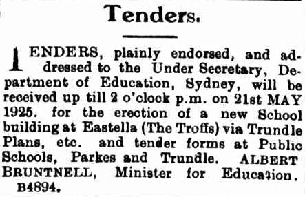 The Troffs did have a small school, although it was not called by the locality’s name. It was called “Eastella”. It originally opened in 1926 and then closed in 1932. Five years later it reopened but was then finally closed in 1940 ( Source: J.P. Watts & C.F. Wright (1987) p317). Not a lot of information is available about Eastella school. Parkes Library would love to hear from anyone with stories, memories and/or photographs of Eastella school.