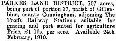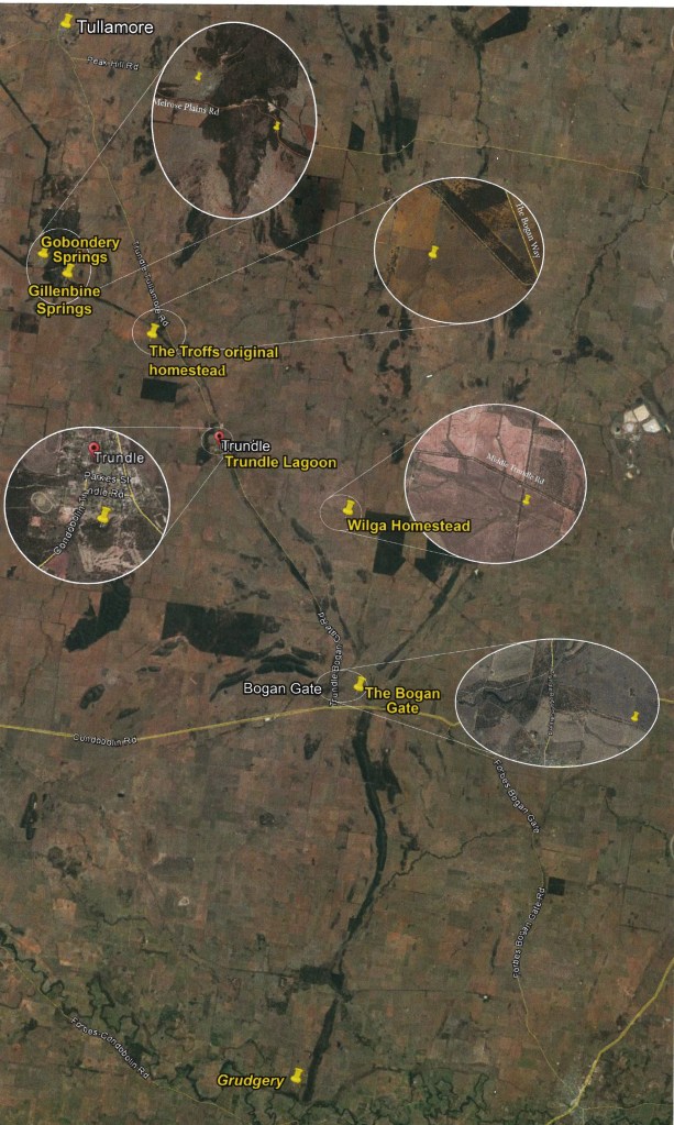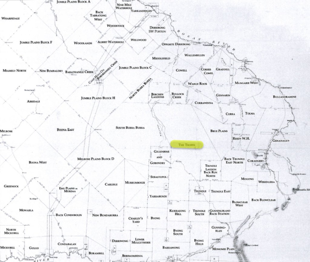 The Troffs Run was first taken up by William Cummings (of “Clear Creek” near Bathust) in 1864 when he applied for a Crown Lease of all the vacant land between Trundle Lagoon and Mungery Runs (Application No.52 of August 1864).