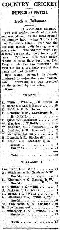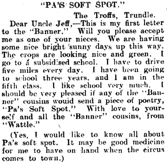 In the same newspaper, another The Trundle Star report was reproduced. This interview was with Fred Beuzeville, the son of Herbert Marshall Beuzeville. H.M. Beuzeville was a prolific writer, using the pen name of “Bilbie”. Fred Beuzeville told The Trundle Star that the family “…came to the out-station of ‘The Troffs’ in 1884. At that time there was no Trundle.” (Source: The Forbes Advocate May 27, 1927 p.9)
